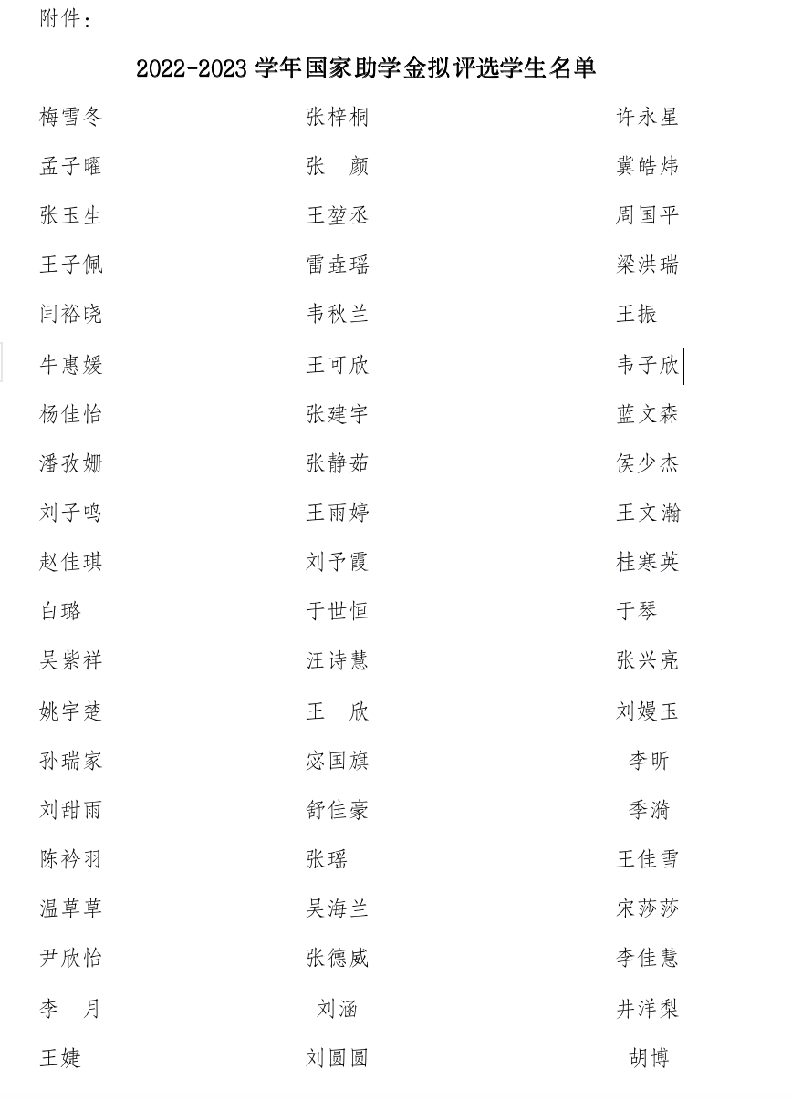 根据《关于评选2022年度国家奖学金、国家励志奖学金、国家助学金的通知》(江海大校办[2022]63 号)和《江苏海洋大学国家助学金实施办法(修订)》(江海大[2021]129号)等文件要求等文件有关规定,经学生申请,班主任同意,学院评审小组评议,共评选梅雪冬、张梓桐等196名学生为本学年国家助学金人选,现面向全院进行公示。公示期5天。如有异议,请于公示期间以书面形式向学院反映。