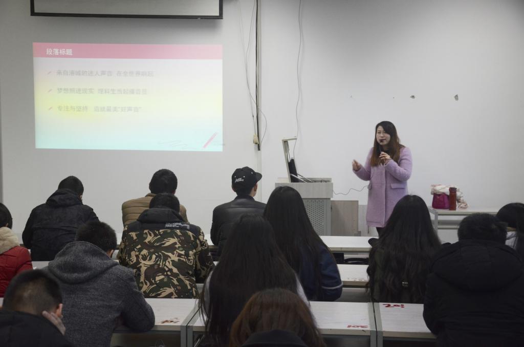 杨主任告诉大家,要写好新闻,首先要明白新闻是什么。“新闻,是沟通感情的”,因此,写出来的新闻要新鲜,有价值。一篇好的新闻能够与读者产生共鸣,打动人心,才能体现出其特别的意义。其次,写新闻前,一定要有清晰的思路,给文章一个明确的规划布局。杨锐冰主任用自己采访淮工走出的央视配音演员汪洋的实例来给大家详细的剖析了写新闻的步骤和方法以及需要注意的问题。杨主任还给了大家四点宝贵的建议:1.做一个生活有心人,挖掘身边有趣的事。2.坚持学习,多读书,看报,每天不断提升自己。3.多参加社会实践,你的每一个阅历都将转换成文字的力量。4.勤学多练,总有一篇作品会让你满意。