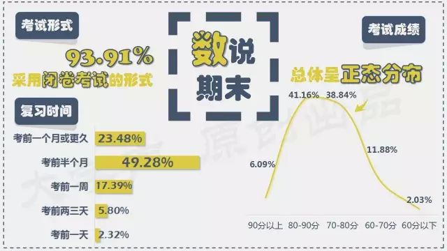 根据调查结果,国内大学生的平均期末考试成绩基本呈以80分为平均值的正态分布,80%左右的同学平均分都在80-90分和70-80分两个区域内,两者各占约一半,而平均分在90分以上的同学,只占总数的6%左右。