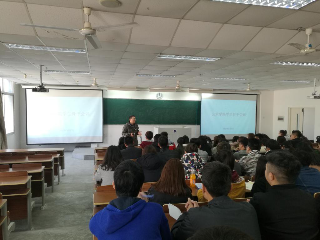 37中午艺术学院在通灌校区TZ310教室,召开艺术学院全体学生骨干会议。参加会议的有院党总支副书记李春、王智金,辅导员英启琛、高慧。