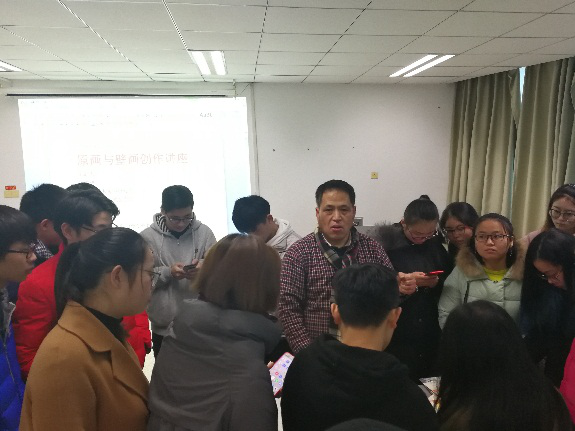 讲座中,张洪建先生毫无保留的展示了其创作的大量册页、人物画长卷原稿,并依据创作原稿就创作技法、构图、用色、材料等问题与学生作了深入讲解与示范指导。张洪建先生作为著名中国人物画家,笔耕不辍,就其创作的西游记、红楼梦等四大名著及元曲连环画作品,红星照耀中国主题系列人物画,西游记主题邮票套票等创意衍生产品,向参加讲座的学生作详尽的现场解析。