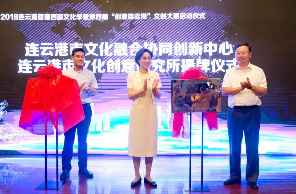 滕雯、宁晓明和杨浩共同为连云港市文化融合协同创新中心和连云港市文化创意研究所揭牌,并启动2018连云港首届西游文化季暨第四届“创意连云港”文化创意设计大赛。连云港市文化融合协同创新中心是市委宣传部与我校艺术学院共建的产学研融合发展中心。