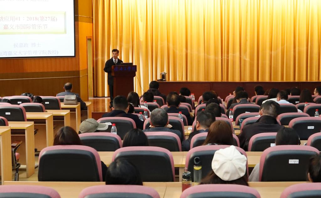 4月10日,台湾嘉义大学企业管理系侯嘉政教授应艺术学院邀请来我校交流并作专题讲座。副校长金芙蓉出席并致辞,艺术学院师生、以及来自市委宣传部、市文化广电和旅游局、市县的文化企业代表聆听了讲座。