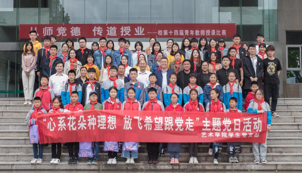 5月18日上午,由艺术学院学生党支部主办的“心系花朵种理想,放飞希望跟党走”主题党日活动在苍梧校区顺利开展。为了让少年儿童体验大学生活,感受艺术的魅力和信仰的力量,在孩子心中种下理想的种子,放飞成功的希望,艺术学院学生党支部邀请赣榆县墩尚镇岭灶村二十三名中小学生和数名学生家长来到美丽的淮海园体验美好的大学生活。赣榆县墩尚镇组织部长董洪松、赣榆县墩尚镇岭灶村书记张洁、副书记张学刚、副主任许华、艺术学院党总支副书记李春、陆文前,辅导员周冶、赵博出席本次活动。