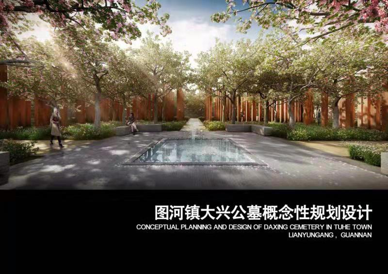 艺术学院以环境设计专业为依托,组建了设计团队,在前期沟通的基础上,6月初派两位专业教师专程前往图河镇进行实地考察,设计团队结合当地地形地貌,按照节约用地、保护生态环境、合理布局的要求,遵循生态性、人文性和地域性的设计原则对大兴公墓进行了全景规划。规划方案以直行路渠为基础划分墓葬区域,曲折小路蜿蜒连绵。入口为孝文化广场,墓葬区域集中于中间部分。墓区分为莲花苑、永慈苑、福寿苑三苑。四周由柳树围合形成廊道,并结合园林景观,形成生态园区。整个墓园绿树掩映,芳草如茵,鲜花明艳,在肃穆中透出园林的明媚,让缅怀之人在不知不觉中超脱自然,越于生死之外,融于自然的景观之中。