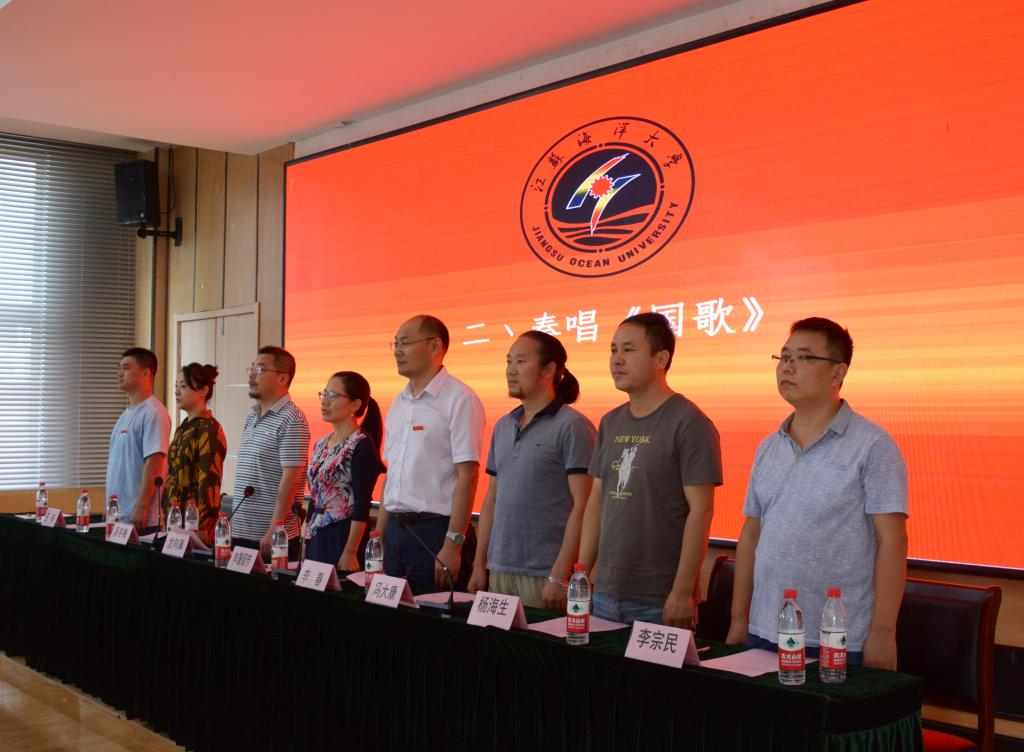 师生一齐观看《江苏海洋大学宣传片》,起立奏唱《国歌》。