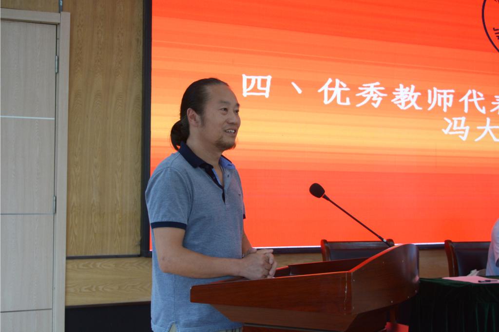 优秀教师代表、艺术基础教研室主任冯大康老师发言。他要求新同学们树立信念,持续努力,认真求学,珍惜时间,未来一定会大有成就。同时也向全体新生保证:“在在艺术学院领导的带领下,每位老师把以德树人作为使命,把帮助学生成材作为自己的根本任务,和同学们一起度过最难忘的四年大学时光!”台下响起阵阵掌声。