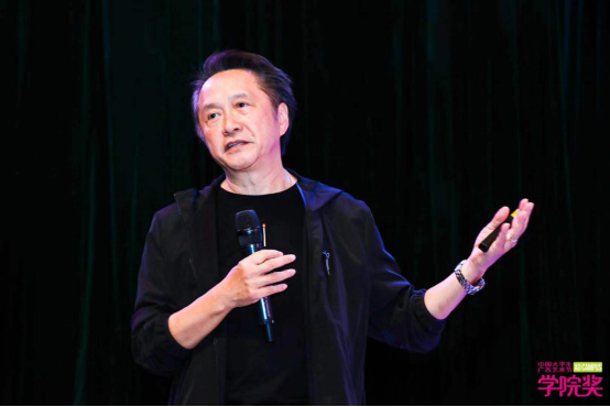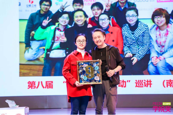 第三阶段是大师谈创意环节。本次的创意大师是Match•马马也创意热店创始人莫康孙先生。在分享会前,2010年学院奖太阳雨命题金奖的获得者,艺术学院13届优秀校友窦灵兮应邀代表艺术学院为莫先生送上了“永生花”,花束中间的“9”代表莫先生与窦灵兮同学九年后再度重逢,永生花则代表莫先生与学院奖、江苏海洋大学的缘分永不凋谢,永远绽放。而后莫先生为现场同学带来诸多优秀案例,同学们听得专注,有的案例甚至让现场老师感动落泪。