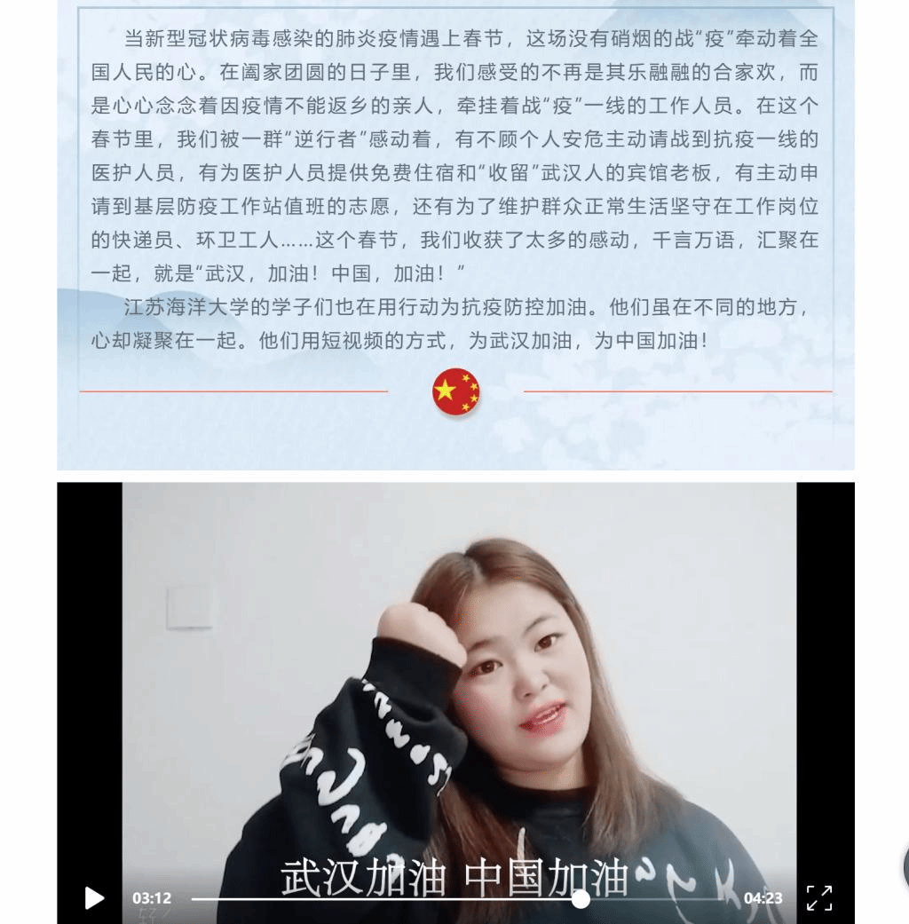 抗击疫情,人人有责。在抗疫期间,江苏海洋大学艺术学院团委、学生会、新媒体、学生党支部的学生代表们,隔空聚力,用行动为抗疫防控加油。他们虽在不同的地方,心却凝聚在一起,拍摄《抗疫防控,众志成城》短视频,为武汉加油,为中国加油。