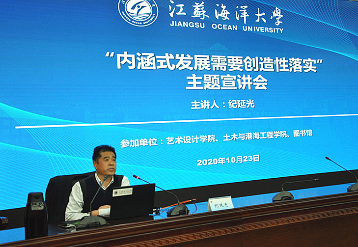 10月23日下午,艺术设计学院联合土木与港海工程学院、图书馆在黄海厅会议中心举办年度理论宣讲会,校党委常委、组织部部长纪延光为三个单位的教职工作了题为《内涵式发展需要创造性落实》专题宣讲。