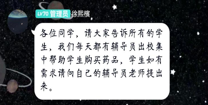 学校封闭管理期间,学生生病就医是最大的难题。学院辅导员老师主动了解有关学生病状,积极联系相关渠道帮助购买治疗药品,有效缓解了学生病状。