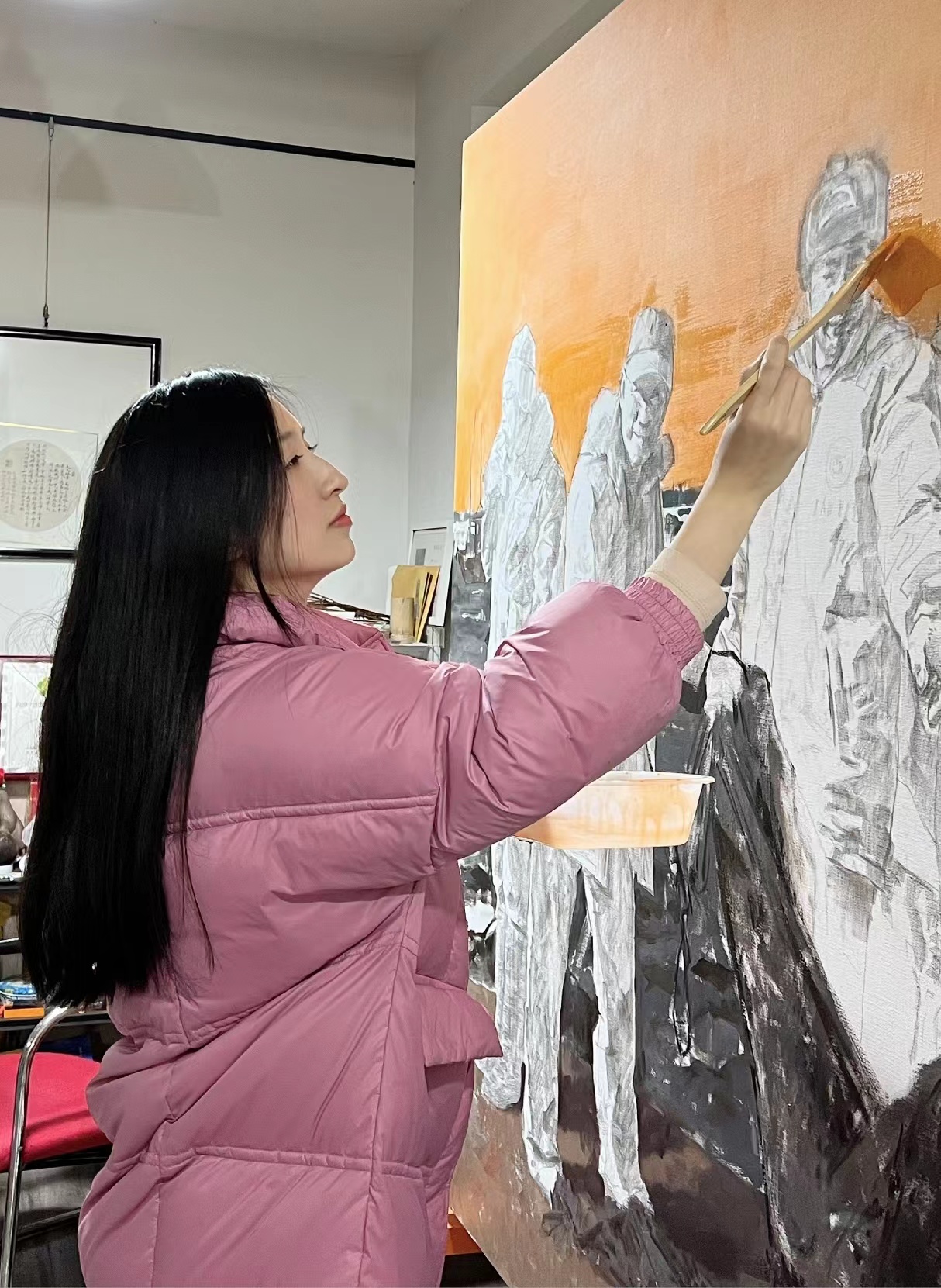 据了解,徐燕老师在2022年元旦期间,在连岛的小渔村里,她捕捉到了渔民在夕阳的暖光下整理渔网、笑谈生活、憧憬未来的质朴、动人的画面,当时仅创作素材就拍摄了两千多张。徐燕回到画室后整理人物形象、设计环境色彩、斟酌绘画语言,历经两个多月时间最终创作出了这幅两米乘两米的大画图稿——《夕阳欢歌》。