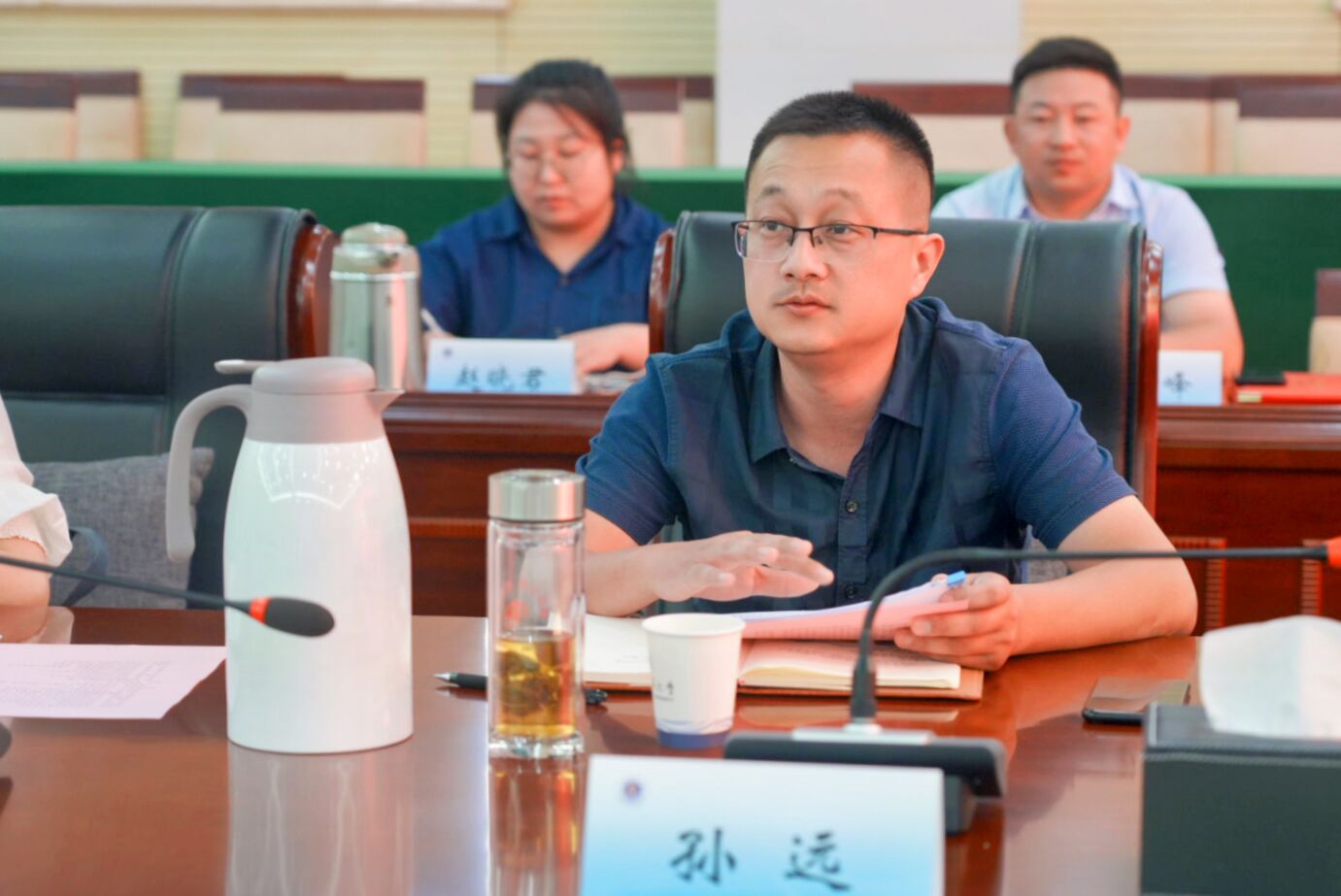 马恒通处长向来宾介绍了我校大学生就业创业方面的基本情况,近年来我校毕业生就业率一直保持较高水平,针对疫情等特殊情况,学校发动各种资源,开展多场线上线下大型集中招聘活动,在用人单位和学生之间建立起了畅通渠道,他表示学校与姑苏区的合作有着广阔前景,衷心欢迎各位企业家朋友到学校来开展招聘。
