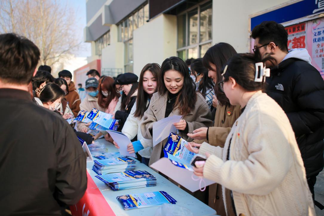 宣讲结束后,全体党员来到设在一食堂北侧的“反诈宣传台”进行现场防诈骗宣传。场地周边事先布置了多块校园安全宣传海报和反诈骗宣传横幅,大家一边发放防诈骗宣传单和纪念品,一边对路过的同学作防诈提醒。活动现场学生参与度高,气氛热烈。