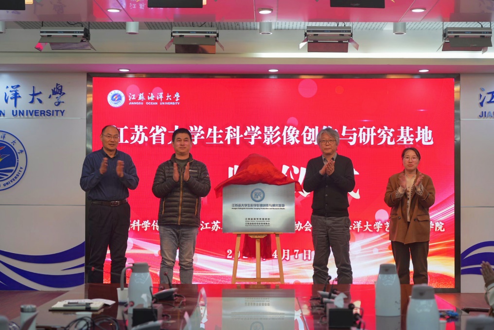 江苏省大学生科学影像创作与研究基地揭牌仪式随后进行,张学超老师和学院党总支书记李春、副院长曾英、王栋老师(基地主任)共同为基地揭牌,基地正式落户我院也标志着我院师生在进行科学影像创作中有了更加广阔的平台,将会有力推动学院在科普影像作品创作等方面的工作。