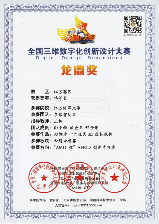 2024年12月6日-8日,第17届全国三维数字化创新设计大赛全国总决赛在北京理工大学举行,我院东家智创团队成员向小雨、熊金玉、邢子彤的作品《十二生肖3D虚拟服饰》获得“AMD杯“AI+3D创新专项赛“最佳创新单项奖”、“龙鼎奖二等奖”和“江苏赛区特等奖”!