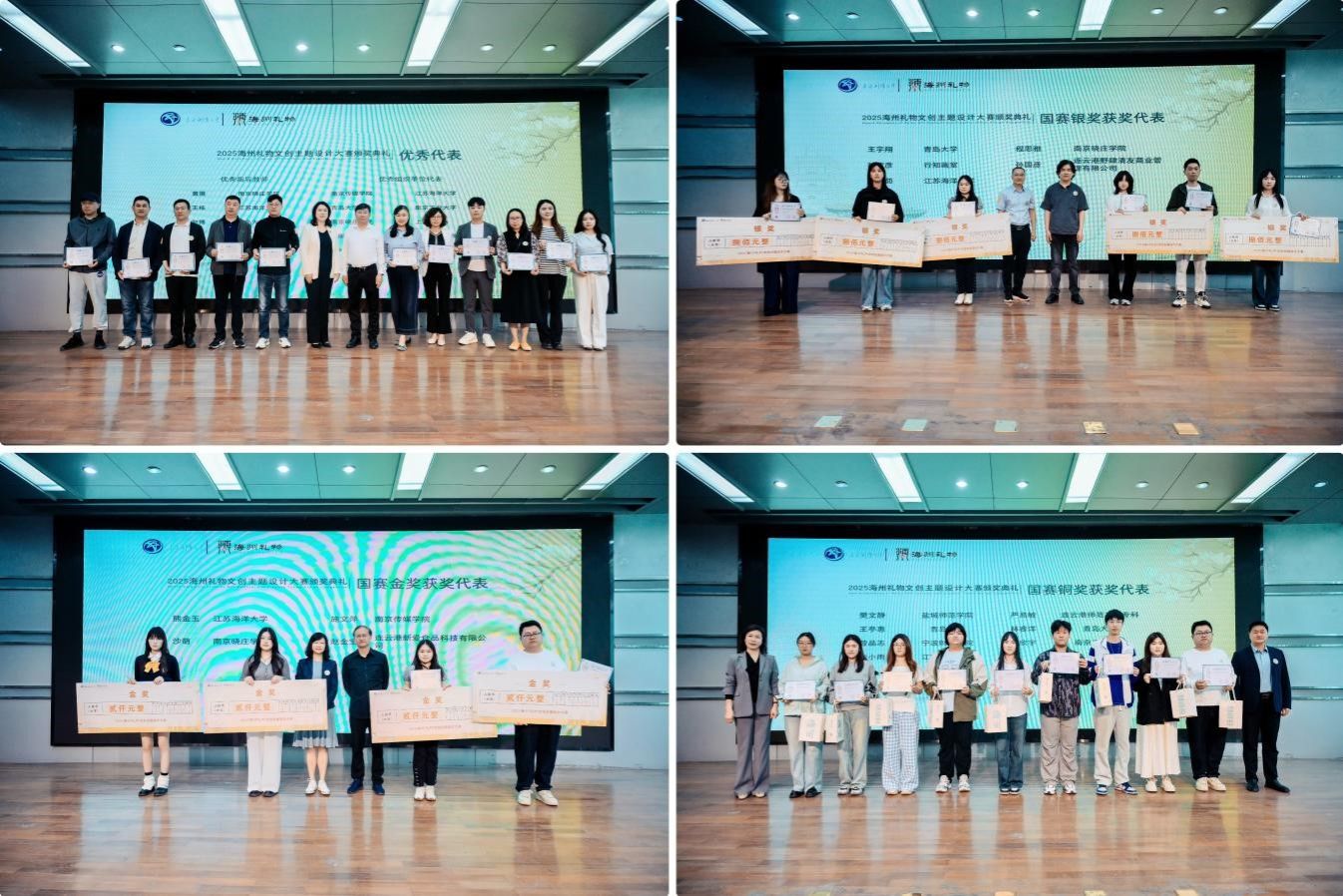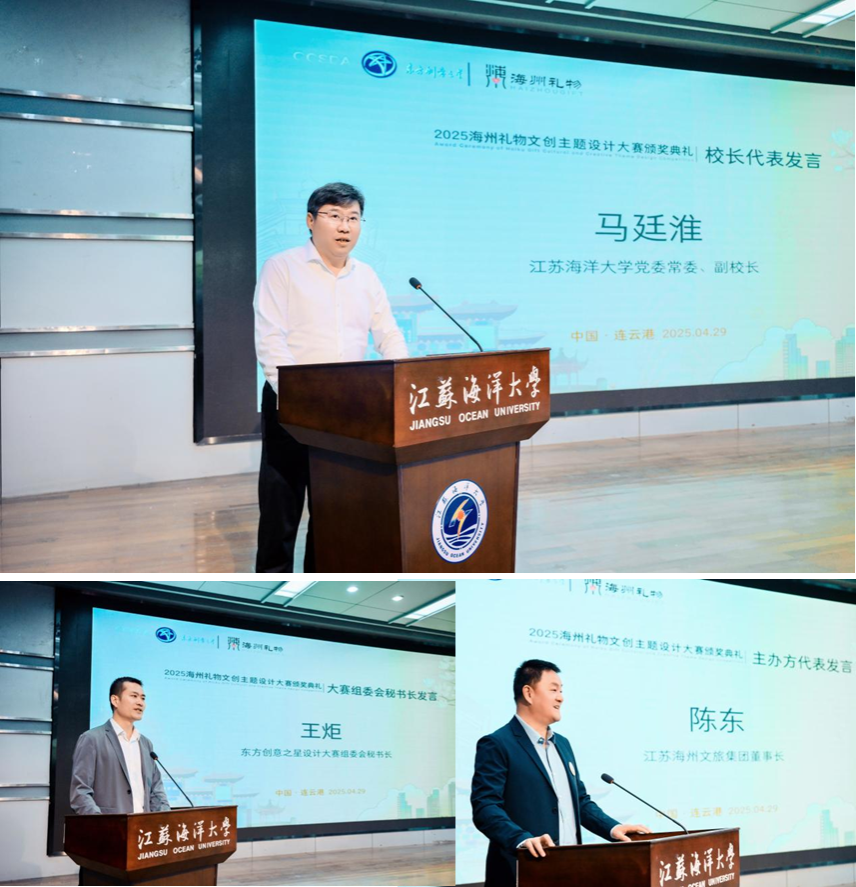 颁奖典礼开幕式环节,江苏海洋大学党委常委、副校长马廷淮代表学校对与会领导和嘉宾表示热烈欢迎,他强调,高校作为知识创新和人才培养的重要阵地,在文创产业发展中扮演着不可或缺的角色。高校拥有丰富的学术资源、前沿的设计理念以及充满创造力的年轻学子,能够为文创设计注入源源不断的活力与灵感。通过举办此类文创大赛,高校不仅为学生提供了展示才华的舞台,更能将学术研究与社会实践紧密结合,培养出适应时代需求的创新型设计人才,推动文化创意产业的蓬勃发展。同时,高校文创成果的转化,也有助于传播校园文化,提升学校的社会影响力,为高校与社会的深度融合搭建起坚实的桥梁。东方创意之星设计大赛组委会秘书长王炬介绍了海州礼物文创主题设计大赛所取得的成就与影响力,并特别点明了大赛呈现出的三大特征和创新点:初步建立了政企校协同创新机制、打造了打造产教研融合新范式,并逐步显现对推动产教研协同创新发展的促进作用。通过赛事活动,成功构建了一个全新的设计创新体系,促进了设计产业化,旨在将海州礼物文创主题设计大赛打造成品牌赛事,赋能连云港海州区文旅文创产业高质量发展。江苏海州文旅集团董事长陈东先生作为赛事主办方代表进行总结发言,他指出,“海州礼物”不仅是文创产品,更是海州文化的载体与传播者,传递着海州人民对美好生活的向往。大赛的成功举办为海州文化的传承与创新开辟了新路径,众多优秀作品将为海州文旅产业注入新活力。他希望专家学者继续关注并支持海州文化的发展,鼓励参赛学生持续发挥创意,创作更多具有海州特色的文创精品,共同让海州文化在新时代绽放更加绚烂的光彩。