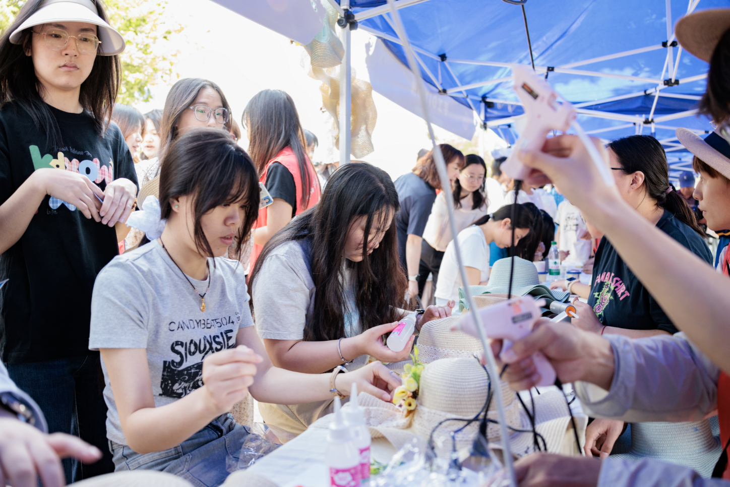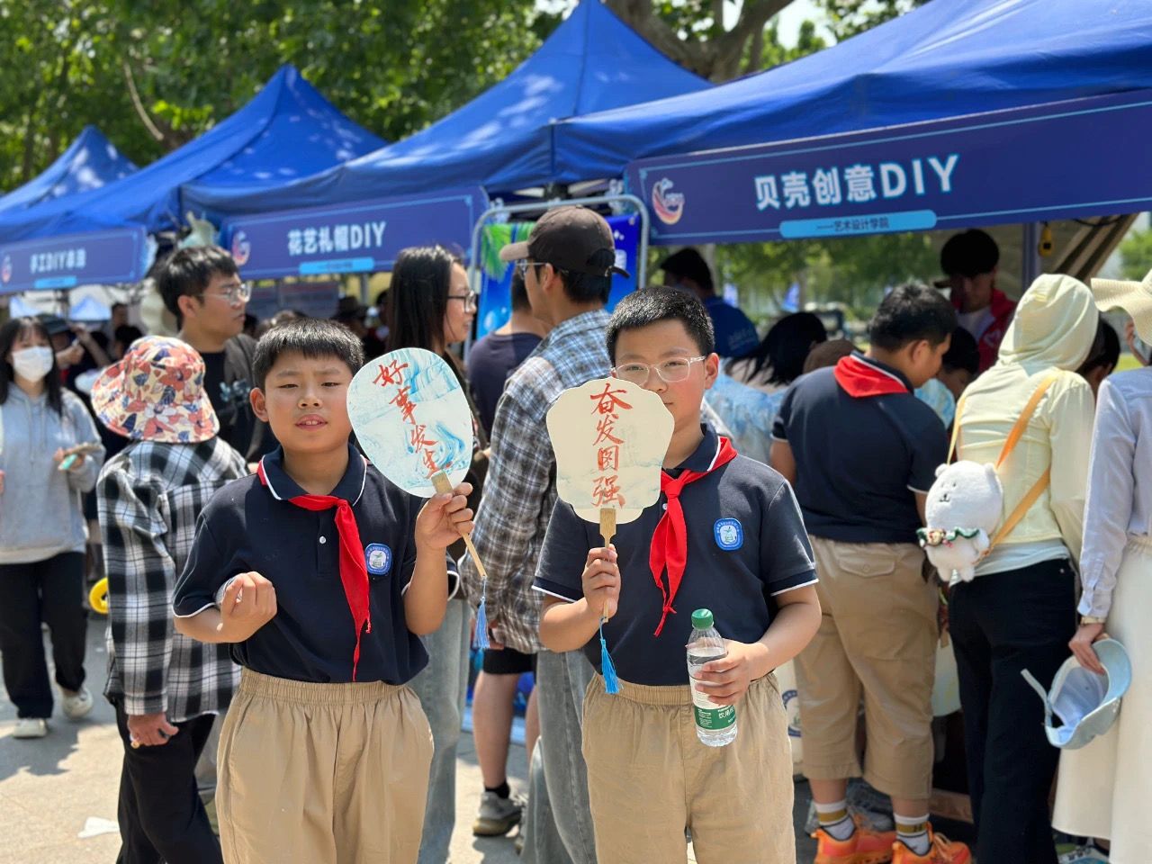 在校“海洋嘉年华”启动仪式现场,艺术设计学院围绕“渔耕文化”主题,将传统渔耕文化元素巧妙融入手工DIY串珠、花艺礼帽DIY和漆扇题字三项艺术体验活动中。手工DIY串珠以蓝色串珠、海洋素材挂件等海洋元素为灵感,参与者亲手串起海洋风情;花艺礼帽DIY则让师生发挥创意,用鲜花绿植和海洋素材配饰装点帽饰,感受自然与艺术的融合;漆扇题字环节,书法爱好者和艺术学院教师挥毫泼墨,在扇面上书写与渔耕文化相关的诗词,赋予传统扇面新的文化内涵。师生们热情高涨,在动手实践中感受渔耕文化魅力,现场气氛热烈。