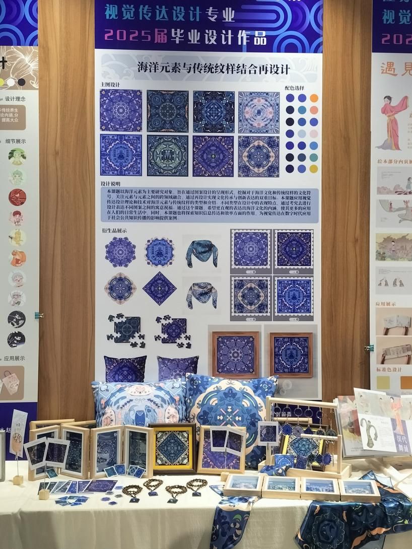 正值毕业季,江苏海洋大学艺术设计学院2025届视觉传达专业本科生毕业设计展正式启幕。本次展览以“文化共生”为主题,校内、校外均设有展场。校内展场位于艺术展览馆,6月6日开幕,持续至6月20日;校外与连云港市图书馆联合举办的城市毕设展于5月30日启幕,将持续至6月29日。同时,与苏宁广场联合策划的另一场城市毕设展也正在紧锣密鼓地筹备中。本次毕设展不仅是莘莘学子四年学业的总结,更是一次立足本土文化根基、探索设计当代表达、连接未来视觉趋势的集中呈现。学生们深入中华优秀传统文化的浩瀚宝库,从中汲取精神滋养与灵感源泉。无论是历史典故的重构演绎、地域民俗的现代转化、传统工艺的匠心独运,抑或东方美学意境的当代营造,都成为设计语言得以生发的沃土。