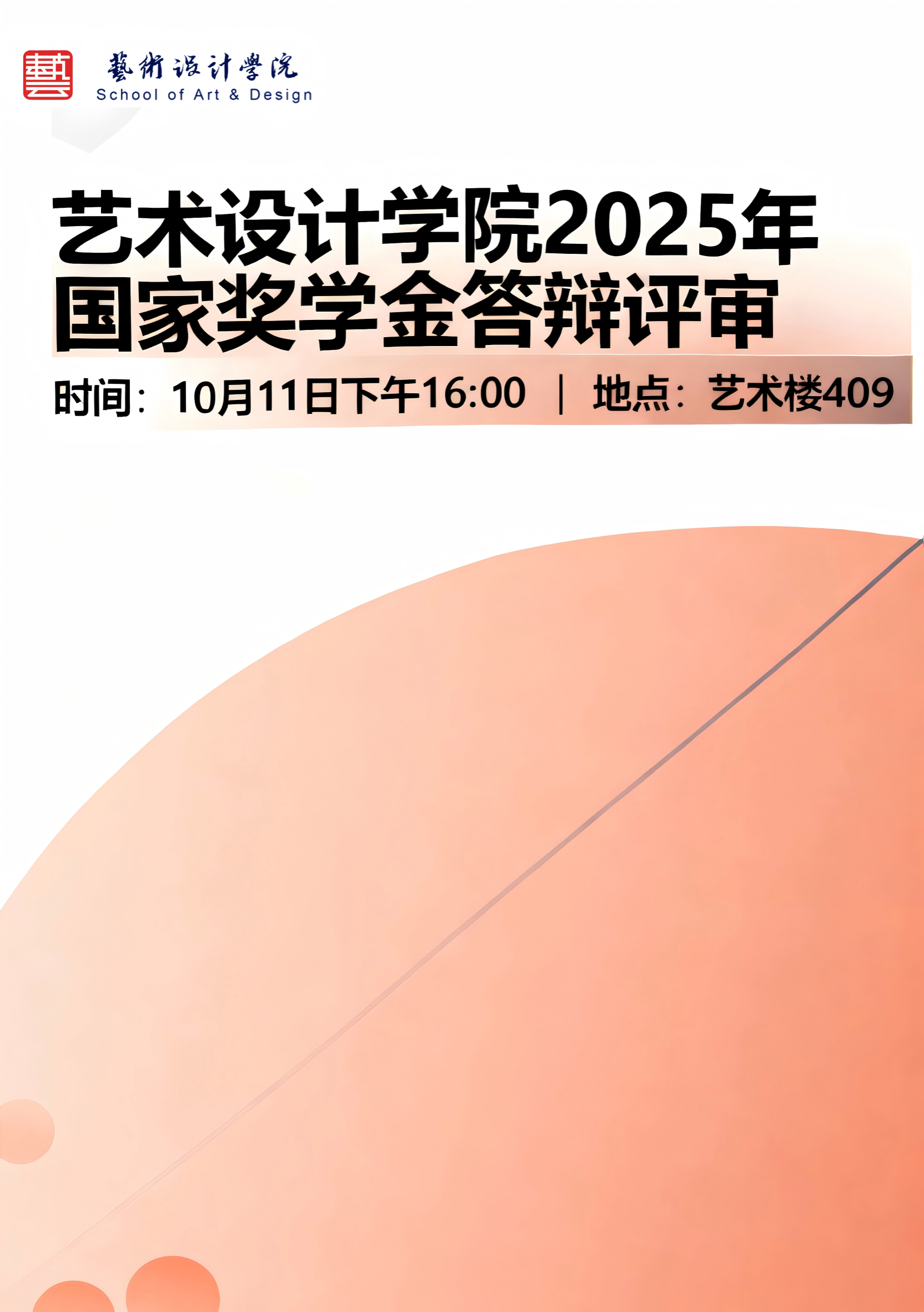 10月11日,艺术设计学院在艺术楼409会议室举办本科生国家奖学金评审答辩会。本次答辩旨在选拔综合素质优异的本科生,充分发挥国家奖学金的示范激励作用,营造勤学笃实、争先向上的校园学习氛围。