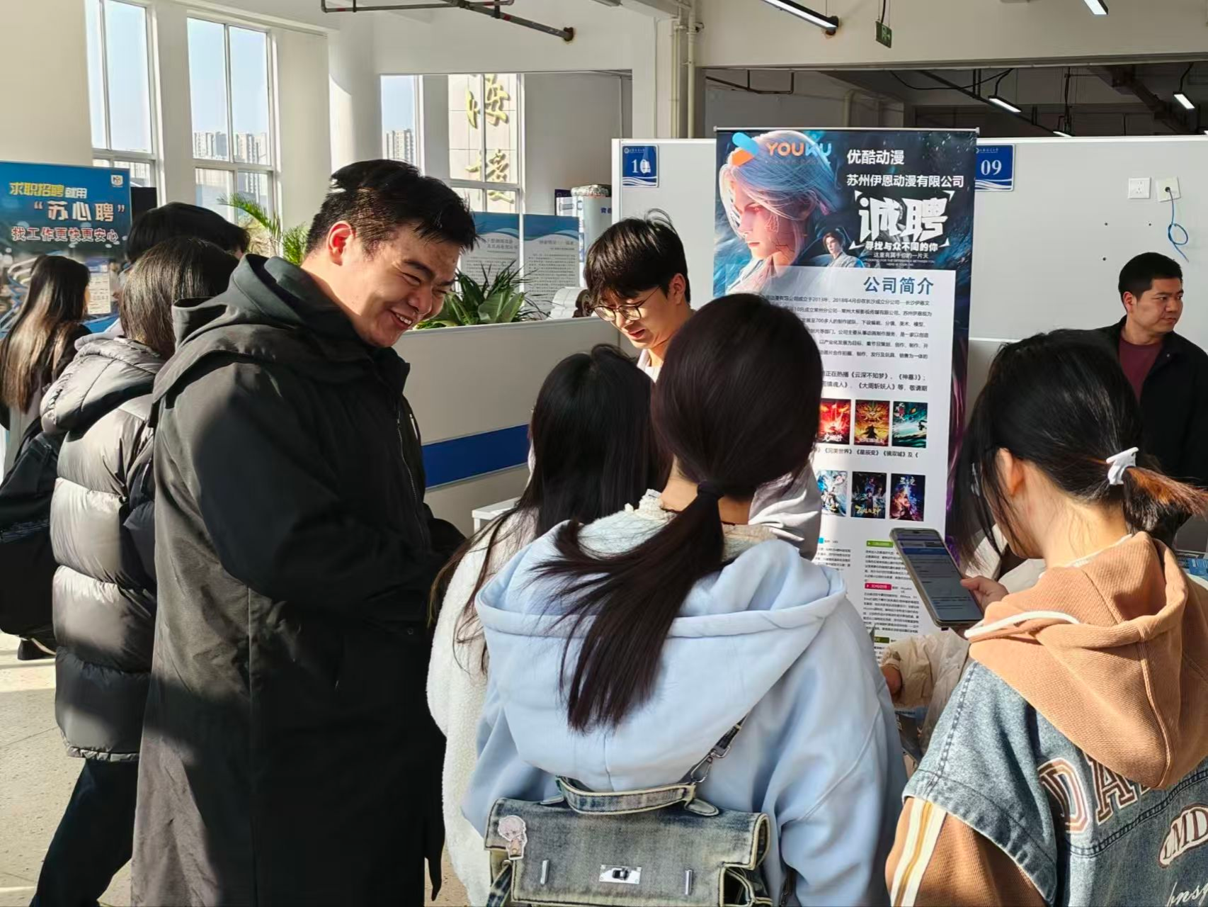 本次招聘会共汇聚23家来自游戏、设计、传媒、教育等领域的优质企业,包括上海点晴信息科技有限公司、上海彩宇文化传播有限公司、苏州伊恩动漫有限公司、江苏海州文旅集团有限公司等知名单位,提供500余个就业岗位。飞扬网络、点晴科技等企业带来游戏开发、美术设计等岗位,为数字艺术类专业学生搭建“行业初体验”的桥梁;伊恩动漫依托优酷S级动画项目,开放动画全流程实习与就业机会;新旭建设、INNER GRAVITY等公司则在设计与传媒领域提供多元化职业路径。各家企业不仅释放了丰富岗位,更带来了行业一线的视野与资源。