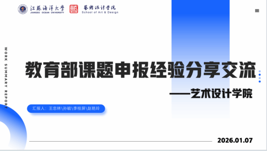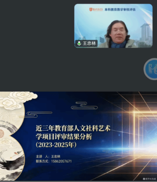 2026年1月7日,艺术设计学院特邀盐城师范学院王忠林院长,以及赵艳玲、李桂屏、孙毓三位资深教师,开展教育部人文社科艺术类项目立项与申报专题线上讲座。学院全体教师参与本次活动,旨在学习科研项目申报经验,提升课题立项成功率。