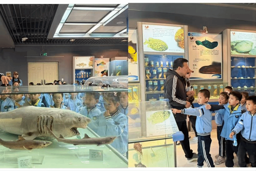 活动伊始,学生党员志愿者们有序带领小朋友们走进学校海洋馆,在专业老师的带领下,正式开启探索蔚蓝的奇妙旅程。小朋友们全程神情专注、认真聆听,眼神里满是好奇,不时驻足观察海洋生物标本,主动举手提问,展现出极强的探索欲。老师结合海洋生物标本与趣味案例,为小朋友们开展海洋知识铺垫,用生动易懂的语言讲解海洋生物的习性、海洋生态保护相关知识,党员志愿者们在旁协助引导,耐心解答孩子们的各类疑问,共同引导孩子们认识海洋、热爱海洋、守护海洋,在幼小心灵中播下探索自然的种子,同时也充分展现了学校的海洋特色优势。