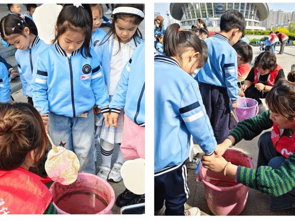 此外,小朋友们来到艺术设计学院展览厅前,沉浸式体验非遗漆扇与非遗蓝染技艺。党员师生提前备好材料、做好示范,手把手指导小朋友们渲染扇面、浸染布料,详细讲解非遗技艺的历史渊源与制作精髓,让孩子们在动手实践中感受传统非遗文化的魅力。孩子们兴致高涨,充分发挥想象力,精心创作属于自己的作品,完成后主动展示分享,脸上洋溢着自豪与喜悦,在趣味体验中接受了传统文化的熏陶,也凸显了艺术设计学院在非遗传承与美育传播中的专业特色。