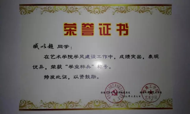 臧以超,艺术学院环境艺术设计152班,现任艺术学院党员工作站干事,艺术学院社联外联部部长,艺术学院辩论队辩手。在2015-2016年两学期中获得两次一等奖学金;在艺术学院学风建设工作中,获得“学业标兵”和“优秀团员”称号;在大二上学期,被评为“三好学生”,并且获得国家一等奖学金;在艺术学院“读书阅品会”比赛中获得一等奖。