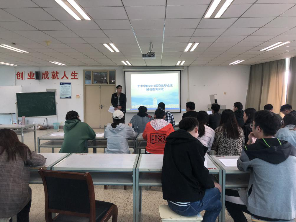 会议在艺术楼401教室举行,艺术学院办理助学贷款的全体毕业生参加了此次会议。会上,辅导员赵老师强调了诚信还款的重要性,建议大家用自己的实际行动书写良好的信用记录。同时,还向2019届贷款毕业生演示了还款流程和注意事项,他希望同学们能够信守承诺,对他人、对社会要讲诚信、按时还款。