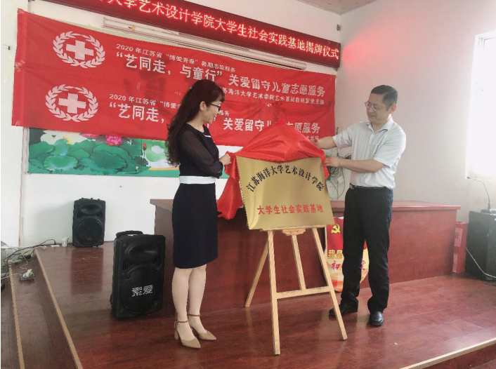 7月16日上午,副校长金芙蓉在校团委、艺术设计学院等部门负责人的陪同下,来到赣榆区墩尚镇岭灶村看望慰问“‘艺同走,与童行’关爱留守儿童”暑期社会实践师生,并出席我院社会实践基地揭牌仪式。