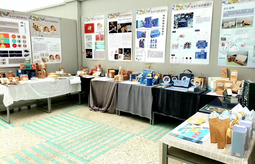 课程作业展览一直是艺术设计学院教学质量评价体系中的重要环节,多年来,艺术设计学院始终坚持多层次立体教学方式提升教学质量,激发学生学习热情。视觉传达设计专业紧随学校和学院的发展步伐,以思政教育引领,以“文化+科技”、“传承+创新”的方式改革教学内容,着力打造“蓝色设计”专业文化概念,构建海洋特色课程群。