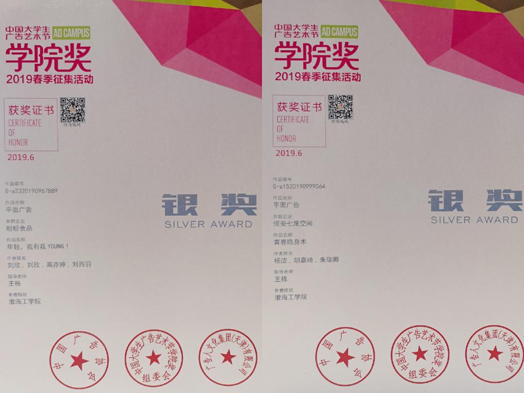 6月26日,2019中国大学生广告艺术节学院奖春季赛颁奖盛典在北京举行。业界大咖、学界专家以及来自全国高校的师生齐聚一堂,共享这场创意盛会。本届赛事,艺术学院学子取得了5银1铜的成绩,等级奖单次获奖人数有了新突破,王栋和刘兮兮两位老师荣获“银奖指导老师称号”。