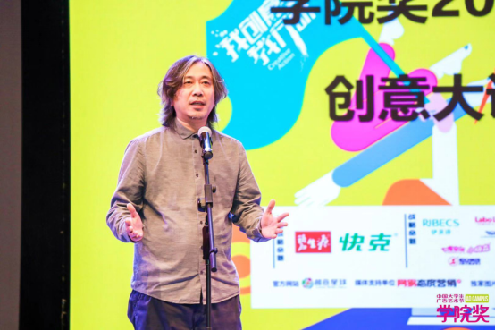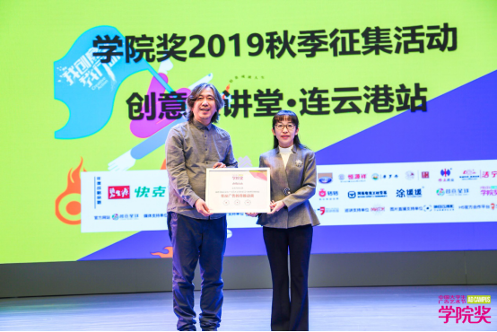 第三阶段是大师谈创意环节。本次的创意大师是Match•马马也创意热店创始人莫康孙先生。在分享会前,2010年学院奖太阳雨命题金奖的获得者,艺术学院13届优秀校友窦灵兮应邀代表艺术学院为莫先生送上了“永生花”,花束中间的“9”代表莫先生与窦灵兮同学九年后再度重逢,永生花则代表莫先生与学院奖、江苏海洋大学的缘分永不凋谢,永远绽放。而后莫先生为现场同学带来诸多优秀案例,同学们听得专注,有的案例甚至让现场老师感动落泪。