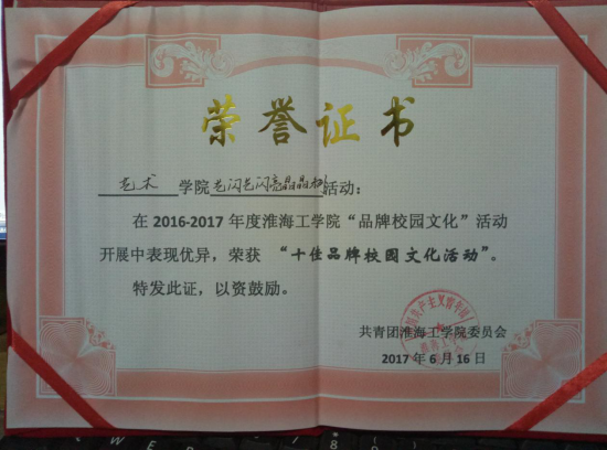 近日,从校团委传来好消息,艺术学院青年志愿者协会在2016-2017学年度举办的“艺闪艺闪 亮晶晶”系列活动荣获淮海工学院“十佳品牌校园文化”活动称号。