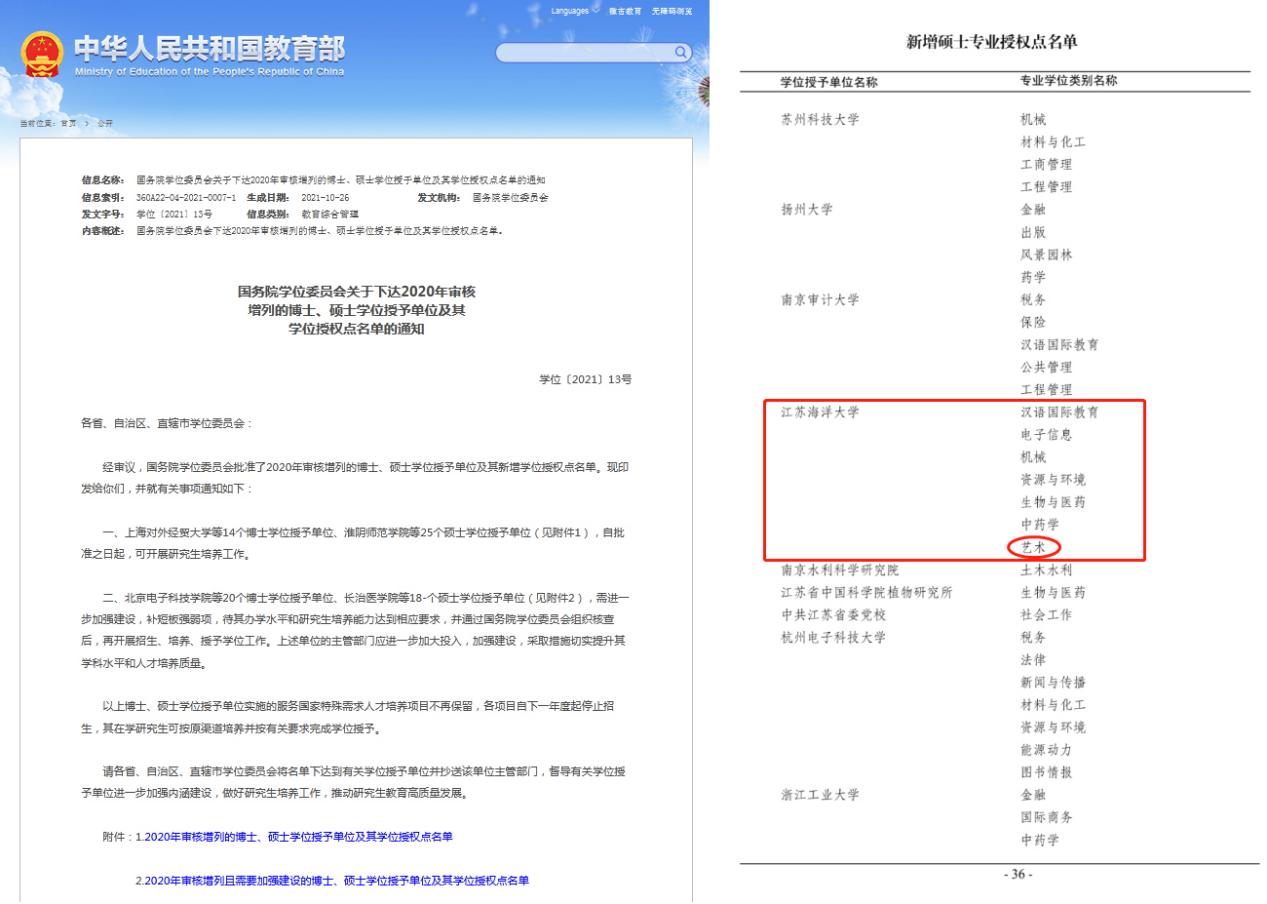 2021年下半年,国务院学位委员会下发了《关于下达2020年审核增列的博士、硕士学位授予单位及其学位授权点名单的通知》。经国务院学位委员会审议,江苏海洋大学艺术硕士专业学位授权点获批。