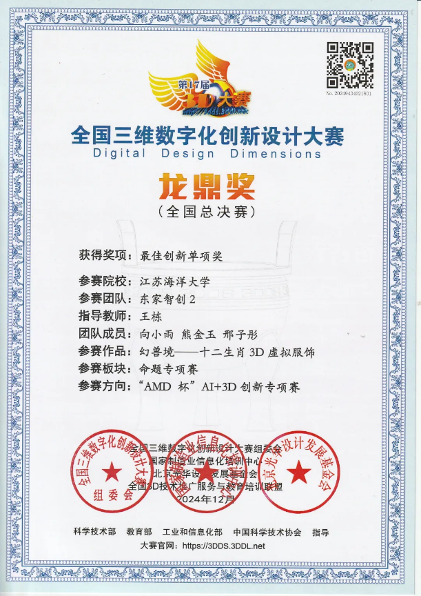 2024年12月6日-8日,第17届全国三维数字化创新设计大赛全国总决赛在北京理工大学举行,我院东家智创团队成员向小雨、熊金玉、邢子彤的作品《十二生肖3D虚拟服饰》获得“AMD杯“AI+3D创新专项赛“最佳创新单项奖”、“龙鼎奖二等奖”和“江苏赛区特等奖”!